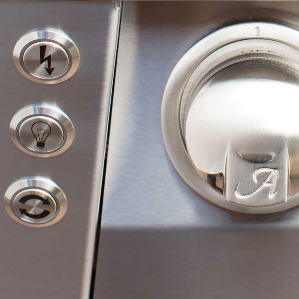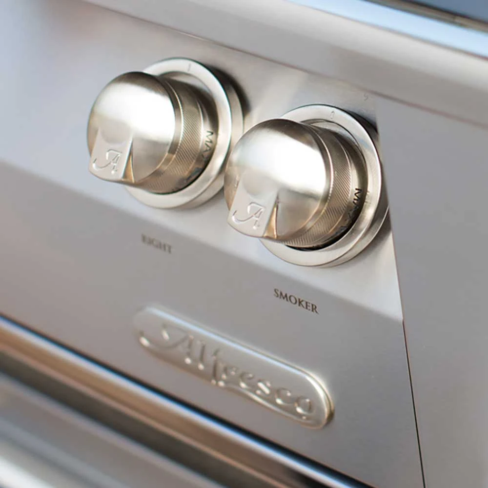 Alfresco Grills brings restaurant-inspired luxury and professional grilling results to your outdoor kitchen with the all-new ALXE series grill. The Alfresco ALXE-56BFG-NG 56-inch built-in gas grill has three(3) high-temperature, titanium and stainless steel blend burners and one ceramic sear zone burner that produce 27,500 BTUs each, for a total of 110,000 BTUs of total cooking power on the grilling surface. The high-tech Sear Zone burner reaches 1500 degrees F in four minutes, and cooks 50 percect faster with virtually no flare-ups. The special V-shaped flavorizer cooking grate also captures the natural juices, fats, and flavors, then caramelizes them to the food for delectable, mouthwatering flavor. The hidden/integrated rotisserie system has two(2) 15,000 BTU rear ceramic infrared burners and a whisper-silent motor with a chain-driven spit that has 120 pounds of turning torque. The rotisserie spit rod can be conveniently stored under the bullnose of the drip tray when not in use. Grill also features a 5,000 BTU smoker system with a stainless steel burner that ejects smoke at 200 degrees onto your grill and a smoker drawer that is large enough to hold peppers, herbs, and wood chunks and is sealed to hold liquids as well. Unique pyramid-shaped ceramic briquettes eliminate hot spots and maximize flavor as they evenly deliver heat to the cooking surface. An air-cooled front control panel keeps your knobs and control panel cool while grilling, protecting both the equipment and your hands from high heat. The 600-degree heat-resistant silicone sleeves protect the electrical wires of the grill. This natural gas grill has a spacious 998 square inches of actual grilling area, a double-lined hood for durability, a removable 3-position warming rack, and heavy-duty rolled stainless steel cooking grids capable of providing perfect steakhouse results. ALXE model grills also feature rich amber/yellow LED front panel lights, stainless steel push-button ignition, lighting and rotisserie controls, a new torsion spring-assisted hood system, and nickel-plated, ergonomically-designed knobs and bezels. This Alfresco, all-American Made gas grill includes a premium grill cover with the purchase of the unit.