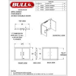 The Bull BBQ 26-inch horizontal 89970 stainless steel single access door integrates perfectly with your Bull outdoor BBQ island. This door provides access to a cutout storage area that can hold your BBQ accessories for your outdoor grilling area. The Bull 89970 horizontal access door features a lock for securely storing your items and a durable single walled 304-grade stainless steel construction.