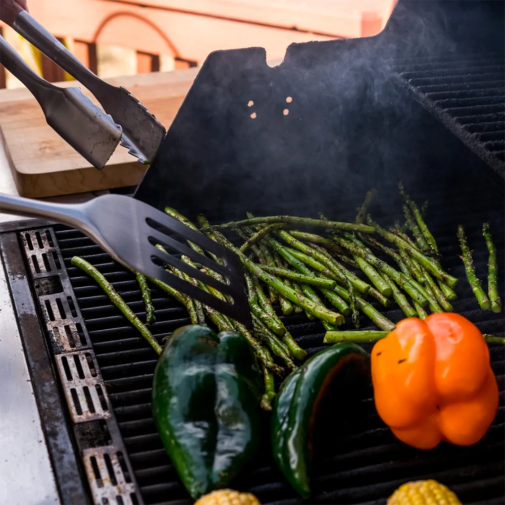 The Drip EZ 3-Piece Grilling Tool Set is the perfect lineup of tools to help you grill like a pro! Designed with utility and durability in mind, the three-piece set includes a spatula, tongs, and a grilling fork. Sleek solid rosewood handles with stainless steel tool body. Leather hang ties for easy storage on side of the grill or smoker. Bonus bottle opener on the end of the spatula. Rosewood handles. Durable Stainless Steel tool body. To clean, hand washes with soap and warm water. Dishwasher is not recommended to ensure wood longevity.