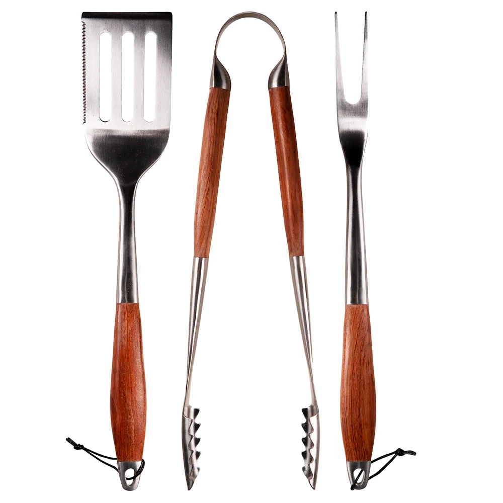 Drip EZ 3-Piece Grilling Tool Set With Stainless Body And Rosewood Handles – Spatula, Tongs, And Fork