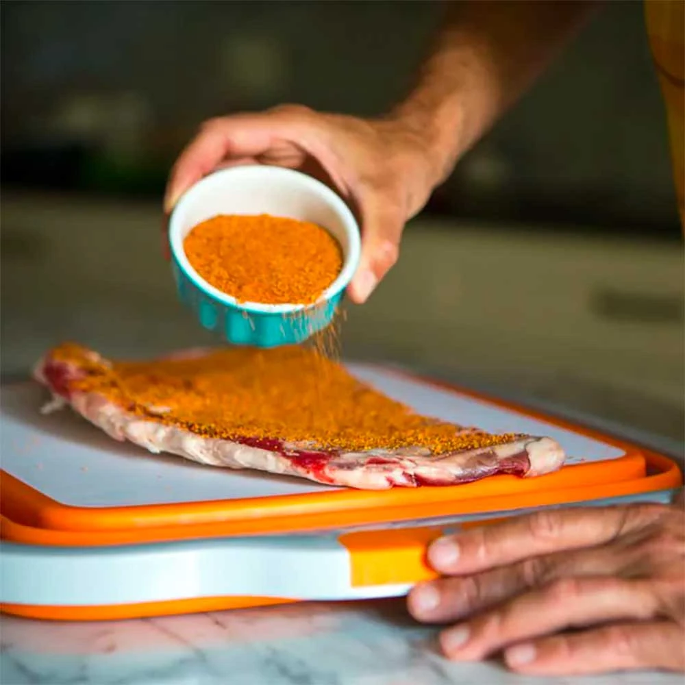 For mess-free prep for your next BBQ, the Drip EZ Jr. Prep Tub has you covered! This orange tub is perfect for applying dry rubs or marinades without spilling. It also collapses so you can use the built-in cutting board after your food comes off the grill. After prep is done, clean it out and fill it with ice to keep your beverages cold. The collapsible design makes the Drip EZ tub compact for space-saving storage. A lid is included for using the tub for temporary food storage.
