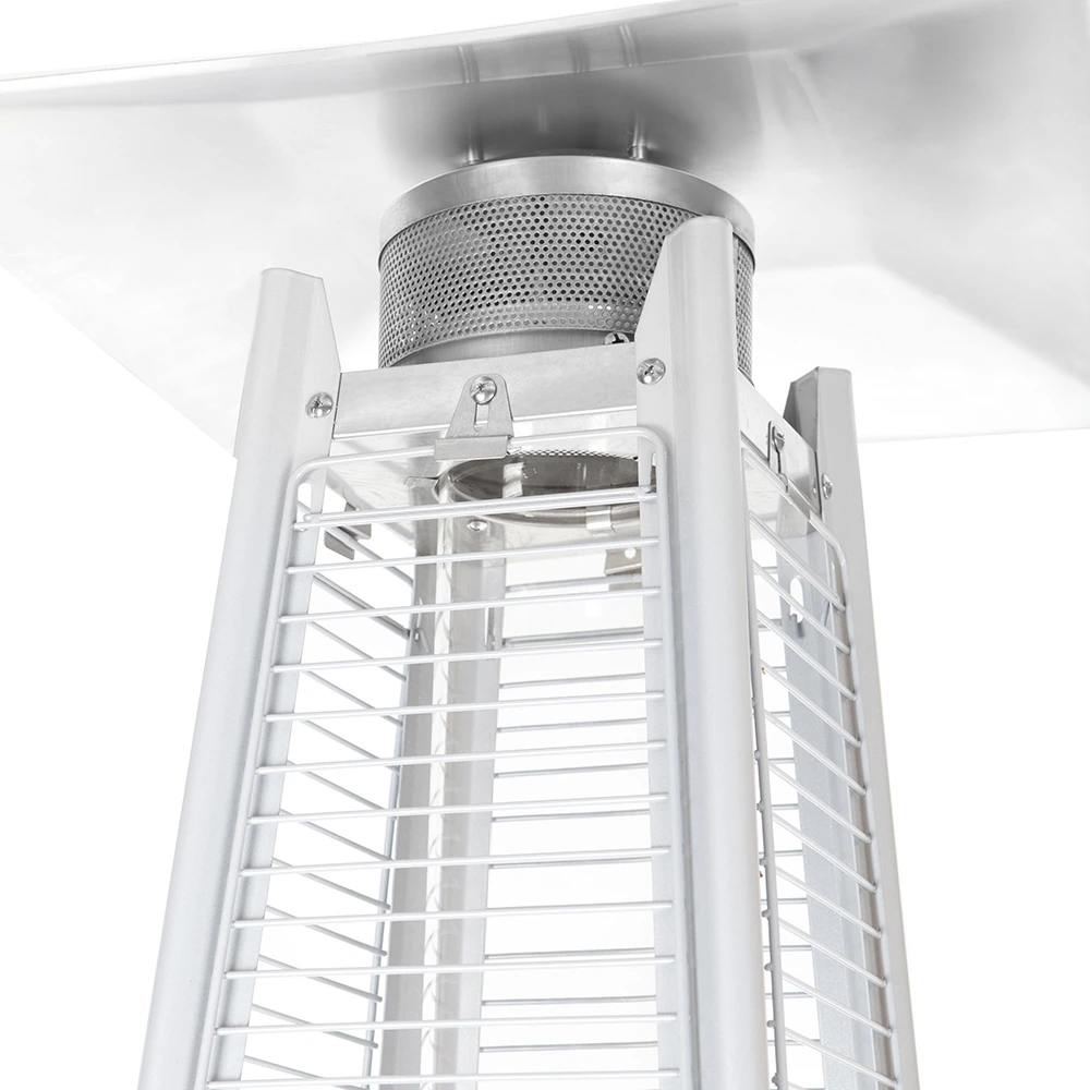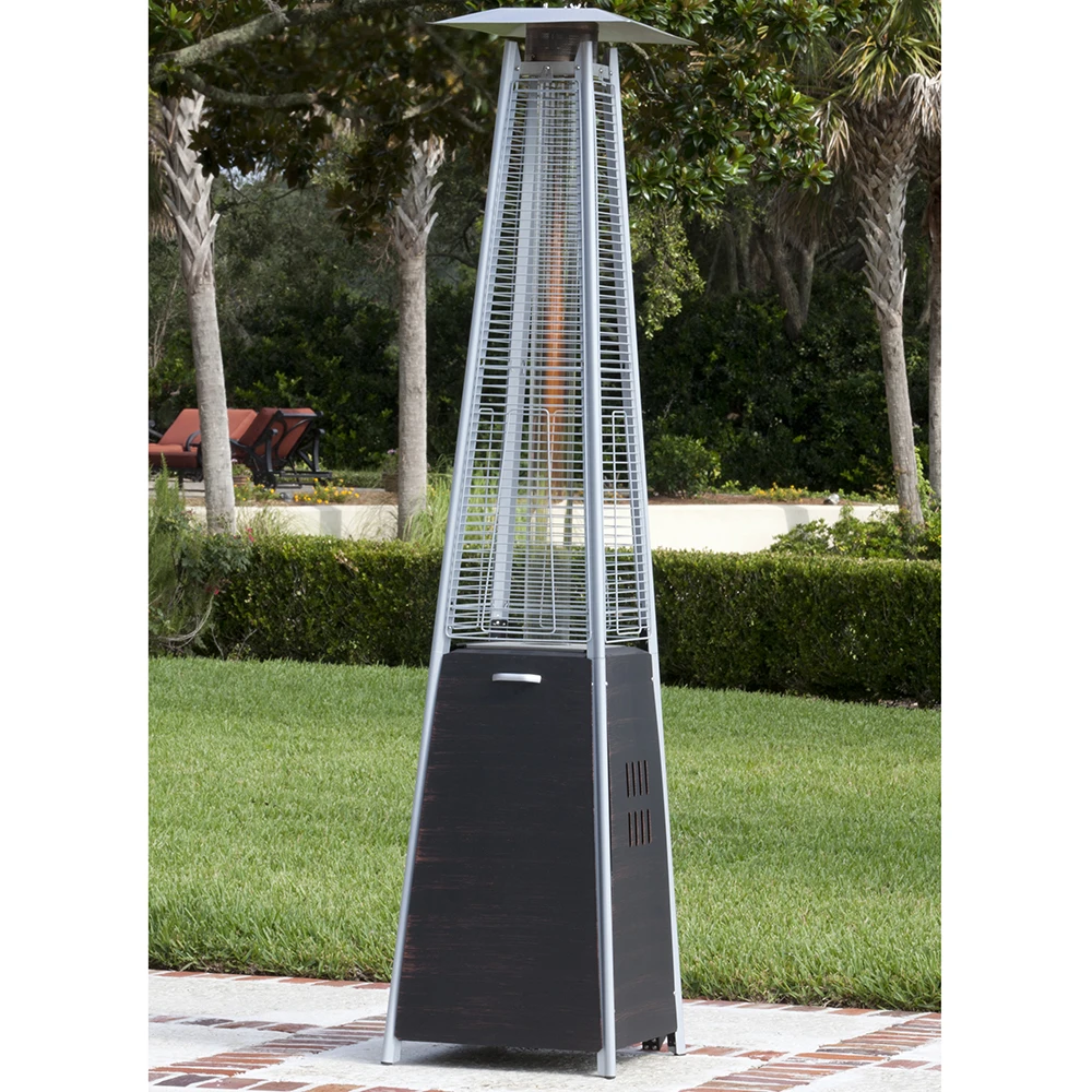 The Fire Sense Pyramid Flame Decorative Fire Feature (62263) will extend your backyard entertaining season by providing a uniquely visual flame and heat in all directions. Constructed with a heavy-duty unique brushed bronze finish, this standing heater is built to withstand nearly any outdoor environment. With a 47,0000 BTU patio heater, you can operate for up to ten hours continuously on a standard 20-pound propane tank (not included). Reliable piezo ignition ensures a safe, easy start-up and the stainless steel burner and heating grid provide long-lasting durability. Built-in wheels make this tower patio heater easily mobile and the included tip-over protection feature keeps you safe. The base of the unit is weighted for increased stability. This patio heater is also ETL approved.