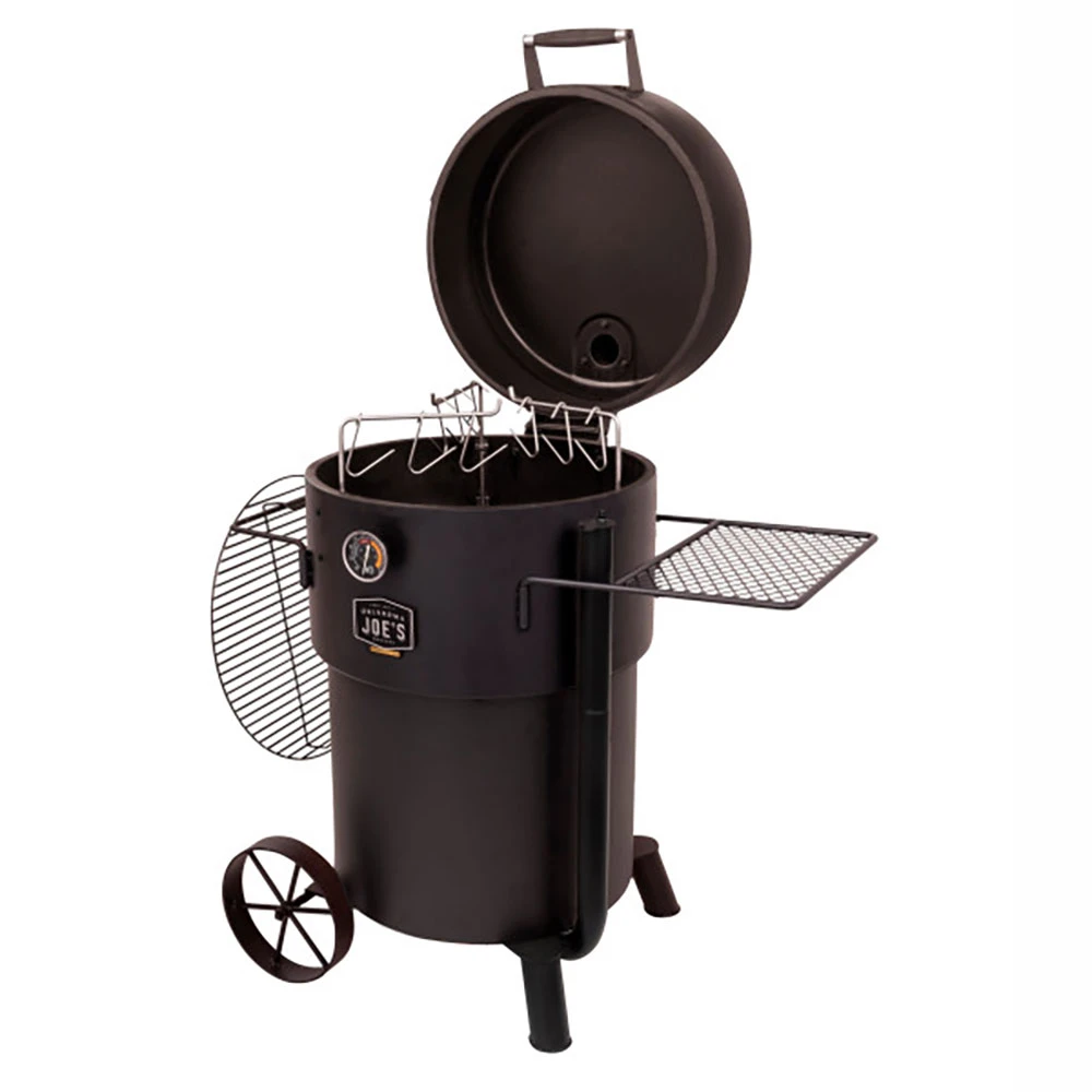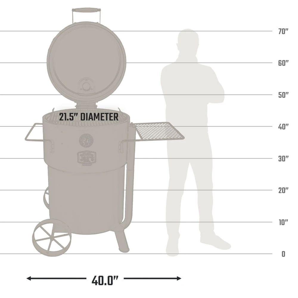 The Oklahoma Joe’s Bronco Pro Drum Smoker (19202099) ups the ante to meet the performance needs of the competition pitmaster. Upgraded fuel and cooking capacity, combined with precision control and customization options, make it the ultimate rig for demanding pros. When the heat is on, the Bronco Pro 19202099 delivers. A large 21 and a half-inch cooking surface and 17-pound fuel capacity deliver competitive performance. The Unique airflow control system provides consistent and precise control over smoking temps. Cooking grate, 3 meat hangers, 9 meat hooks, and a heat diffuser allow for maximum flexibility so you can smoke your way. A large ash pan, porcelain-coated components, and drain cap allow for easy clean-up at competitions. Heavy-gauge steel construction delivers durability that’s built to last for generations to come. The oversized charcoal basket holds enough fuel for over 15 hours of smoking time. Nameplate for custom team graphics. Hinged lid with gasket for a tight seal. Rubber handle grip is easy to grab and stays cool to the touch. Barrel-mounted temperature gauge with glow-in-the-dark accents. Large, wagon-style wheels for easy mobility. Side shelf for holding tools and supplies