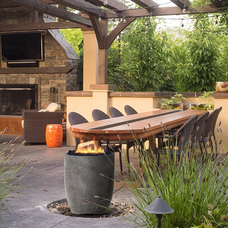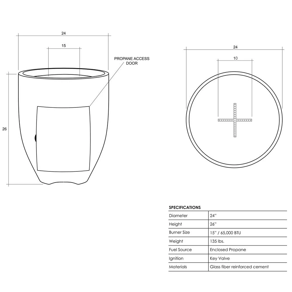 The Pentola 3 Fire bowl provides an outdoor retreat of warmth and ambiance. Each bowl has been hand-crafted using a custom patina finishing process, guaranteeing a one-of-a-kind creation with subtle variation. The 24″ pedestal size provides a beautiful and functional centerpiece for any backyard, patio or lounging area. The ambient heat provides plenty of warmth for multiple people. The 65,000 BTU unit operates with a standard propane tank that fits directly inside the enclosed unit. The key valve housing is easily accessed from the side of the unit. The controls are clearly labeled and simple to use. Turn the key to the on position and use a match lighter to light and enjoy. The fire pit comes complete with one 25lb bag of 3/4-inch lava rock. The naturally occurring volcanic rock creates a stunning contrast to the beautiful flames of any gas fire feature while the lava rock is heat resistant.