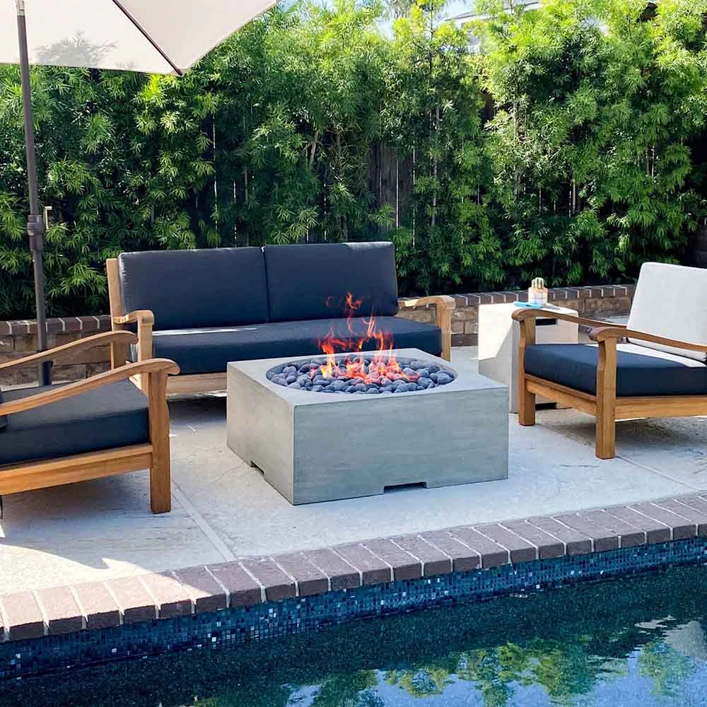 The Piazza fire table and its clean design with straight edges provides an outdoor retreat of warmth and ambiance. Each table has been hand-crafted using our custom patina finishing process, guaranteeing a one-of-a-kind creation with subtle variation. The 39 x 39″ square-shaped table provides a beautiful and functional centerpiece for any backyard, patio or lounging area. The ambient heat provides plenty of warmth for multiple people. This 65,000 BTU unit operates with a standard propane tank. The key valve housing is easily accessed from the side of the unit. The controls are clearly labeled and simple to use. Turn the key to the on position and use a match lighter to light and enjoy. The fire pit comes complete with one 54lb bag of 3/4-inch lava rock. The naturally occurring volcanic rock creates a stunning contrast to the beautiful flames of any gas fire feature while the lava rock is heat resistant.