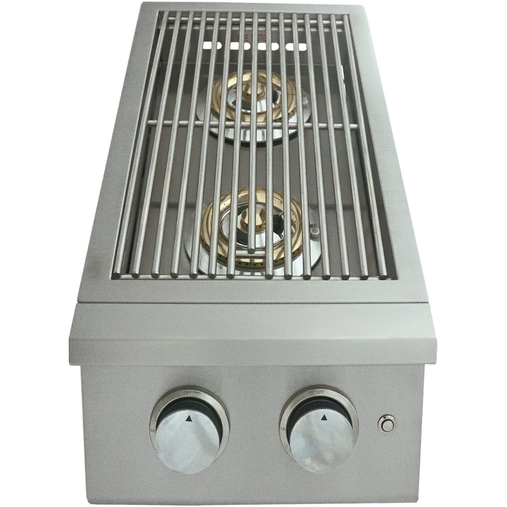 Specially designed for function and performance, the RCS Premier Series double side burner (RJCSSBLLP) is the perfect addition to any outdoor kitchen. Side burners are ideal for cooking sauces and heating other foods that require lower heat than your grill. The RCS Premier Series propane gas double side burner features premium 304-grade stainless steel for durability, heavy-duty 8mm stainless grates, and a stainless steel removable lid. Blue LED lights accent the control knobs for a look that stands out. The side burner must be plugged into an RCS Premier Series grill with lights for the side burner lights to work. Powered by two individually controlled 12,000 BTU brass ring burners, this side burner offers a total of 24,000 BTUs and 205 square inches of cooking area. It also includes a protective stainless steel cover for protection from outdoor elements when not in use.