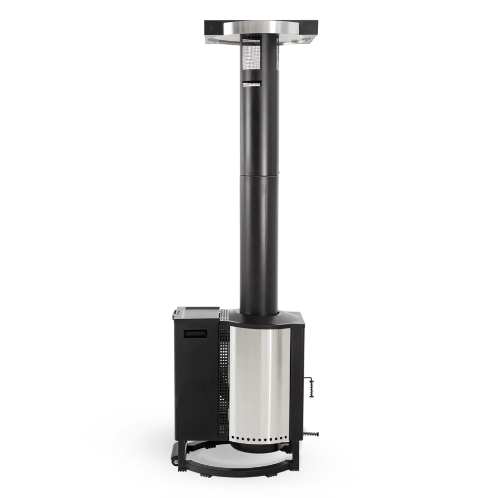 Experience indoor comforts in your outdoor spaces with the smokeless, pellet-fueled warmth of Tower Patio Heater. Fueled by standard wood pellets, Tower boasts over 72,000 BTUs of heat while producing virtually no smoke and minimal ash. With a 25lb capacity, Towers gravity-fed pellet hopper automatically feeds the right amount of pellets into the burn chamber for up to 3 hours of hands-off, outdoor enjoyment. Want to call it a night? The hoppers shutoff handle stops the flow of pellets when the party is over. Do not let the cold keep you indoors. Tower allows you to extend patio season by producing warmth that can be felt from head to toe, with a radius of up to 10 feet. Fortified with cold-rolled steel and 304 stainless steel, Tower is built to last. With a lifetime manufacturer?s warranty, you can rest assured that Tower will provide warmth for seasons to come. Using the handles on the hopper, give Tower a slight tilt to wheel it to the perfect location in your space.