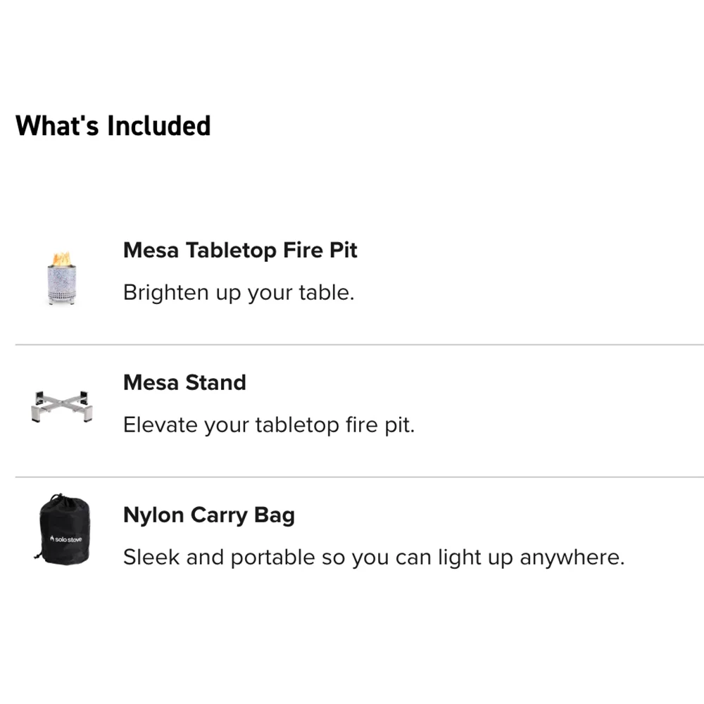 Bring warmth to the table. Mesa is the tabletop fire pit made to elevate the aesthetic of your space. With Dual Fuel capability (pellets and wood) and Signature 360-degree Airflow, anyone can easily ignite and enjoy a smokeless fire. Includes Mesa tabletop fire pit, stand, pellet adapter and nylon carry bag. The Solo Stove Mesa is the perfect way to bring the feeling of the great outdoors right into your own backyard!