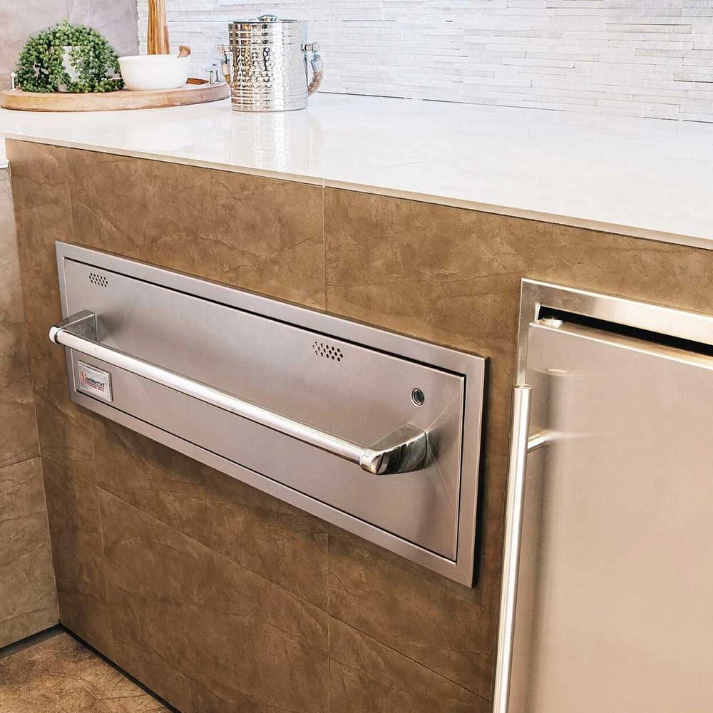 Warming drawers add a level of comfort to a kitchen, indoors or out. Warming drawers are powered by electricity and feature a variable temperature control setting. The exact temperature control range varies among the brands. Expect to find a control range of about 90 to 220 degrees Fahrenheit. You can keep freshly prepared foods at the perfect serving temperature for you and your guests or create mouth-watering dishes cooked low and slow. You can also turn them to the lowest setting and warm food, plates or keep warm towels near a swimming pool. Many models of warming drawers come with adjustable vents on the front panel. This controls the amount of humidity or moisture inside the warming drawer. This is helpful when preparing bread or allowing the steam from freshly grilled foods to expel, preventing the food from becoming overcooked or soggy. Certain models of warming drawers come with various sizes of food pans to offer up a variety of dishes simultaneously. Warming drawers will usually be built from 304-grade non-corrosive stainless steel. The majority of warming drawers are 30 inches in width and others can be found integrated into a 42-inch wide combination cabinet. These are sometimes referred to as warming drawer combos or built-in convenience centers. The 30-inch warming drawer (SSWD-36) from Summerset is ETL certified to use outdoors in your BBQ island. The internal electric heating element allows you to keep food warm and ready for serving without overcooking. Variable temperature settings range from 60 to 220 degrees Fahrenheit, allowing for the ultimate versatility. The drawer features a professional-style drawer handle and extends on stainless rollers for easy opening and closing. The drawer is constructed with 18 gauge 304-grade stainless steel for long-lasting durability.