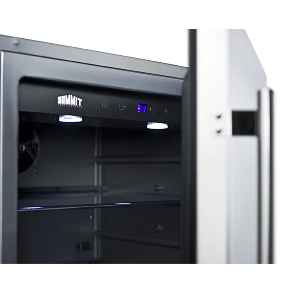 The SPR627OS is a 24″ wide all-refrigerator that can be used built-in or freestanding in any outdoor or indoor location. It features a jet-black cabinet and a reversible stainless steel door with a professional-style handle. A factory-installed lock offers added security. Inside, this frost-free refrigerator includes an internal fan for an evenly cooled interior and a recessed LED light for an elegant yet energy-efficient glow. The digital thermostat (located in the interior) allows you to adjust the temperature at the touch of a button. Adjustable glass shelves make it easy to organize the 4.6 cu.ft. interior. The floor is specially slotted to hold bottles in place. This unit has a flat door liner to accept larger trays. With a stunning design and convenient features, SUMMIT SPR627OS is the ideal finish for any outdoor or indoor kitchen. For a matching freezer, see the SPFF51OS. This unit is ETL-S listed to NSF-7 standards for use in commercial establishments and is ENERGY STAR certified as a commercial refrigerator. It also meets DOE standards for residential applications, using 25% less energy than the maximum allowed for this product class and capacity.