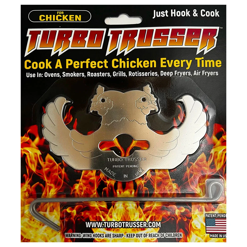 The Turbo Trusser is a rapid trussing device for use with whole Chicken. In just seconds, hook and cook for a perfect bird every time. Use in oven, charcoal smokers, gas grills, roasters, on the rotisserie, and even in deep fryers. The Turbo Trusser is constructed of 304-grade stainless, made in the United States, and is dishwasher safe.